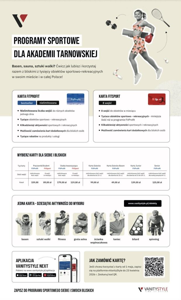 Firma VanityStyle oferuje możliwość dołączenia do programu kart sportowych FitProfit i FitSport. Jedna karta to dostęp do wielu aktywności: basen, siłownia, fitness, joga, taniec, sztuki walki, spinning, ścianka wspinaczkowa, grota solna i wiele innych (będących w ofercie Firmy). Dostępne obiekty sprawdzić można TUTAJ.