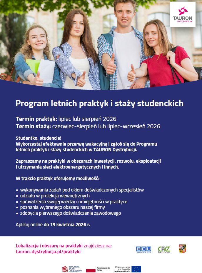Studentki i Studenci Wydziału Nauk Technicznych, szczególnie Elektrotechniki, Automatyki, Robotyki i Inżynierii Elektrycznej mogą wziąć udział w rekrutacji do Programu letnich praktyk i staży studenckich organizowanego przez TAURON Dystrybucja. Rekrutacja już trwa i potrwa do 19 kwietnia 2026 r. Program obejmuje zarówno praktyki wakacyjne, jak i płatne staże letnie.