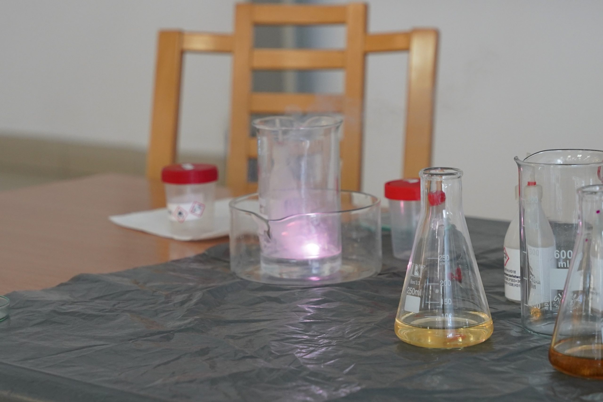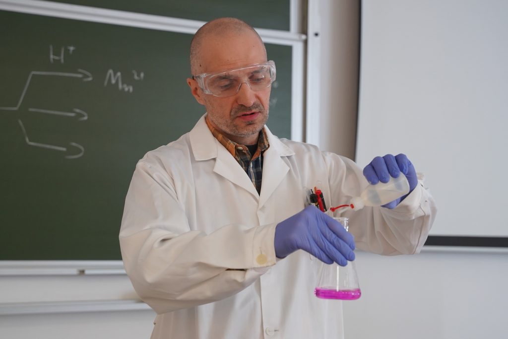 Wydarzenie zakończył pokaz barwnych reakcji związków manganu oraz bardzo efektownych reakcji przedstawicieli metali alkalicznych i metali ziem alkalicznych z wodą, przygotowany przez opiekuna Naukowego Koła Chemików OZON dr. Krzysztofa Kleszcza.