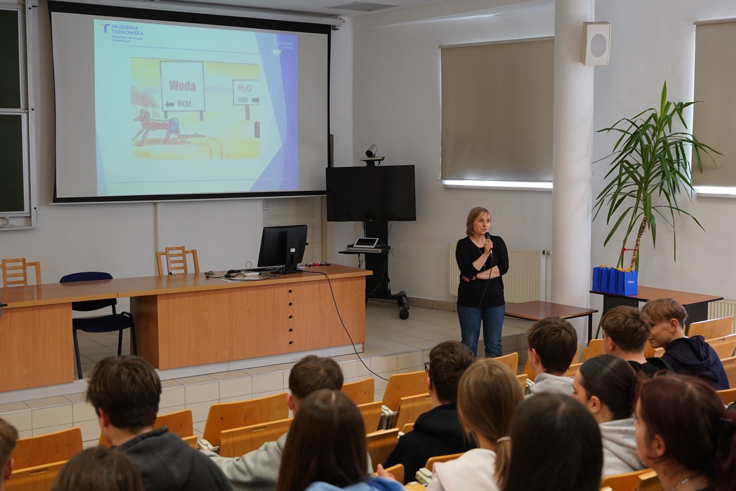 W piątek, 6 marca, uczniowie liceów i techników mogli posłuchać o wodzie i jej kilku niezwykłych właściwościach określanych jako anomalie. Pani mgr Iwona Karoń opowiedziała o właściwościach chemicznych i fizycznych, które sprawiają, że woda jest idealnym środowiskiem dla życia i reakcji chemicznych odpowiadających za procesy życiowe. W krótkim quizie uczestnicy mieli okazję sprawdzić zdobytą podczas wykładu wiedzę, a uczniowie, którzy uzyskali najlepsze wyniki, zostali nagrodzeni. 😊