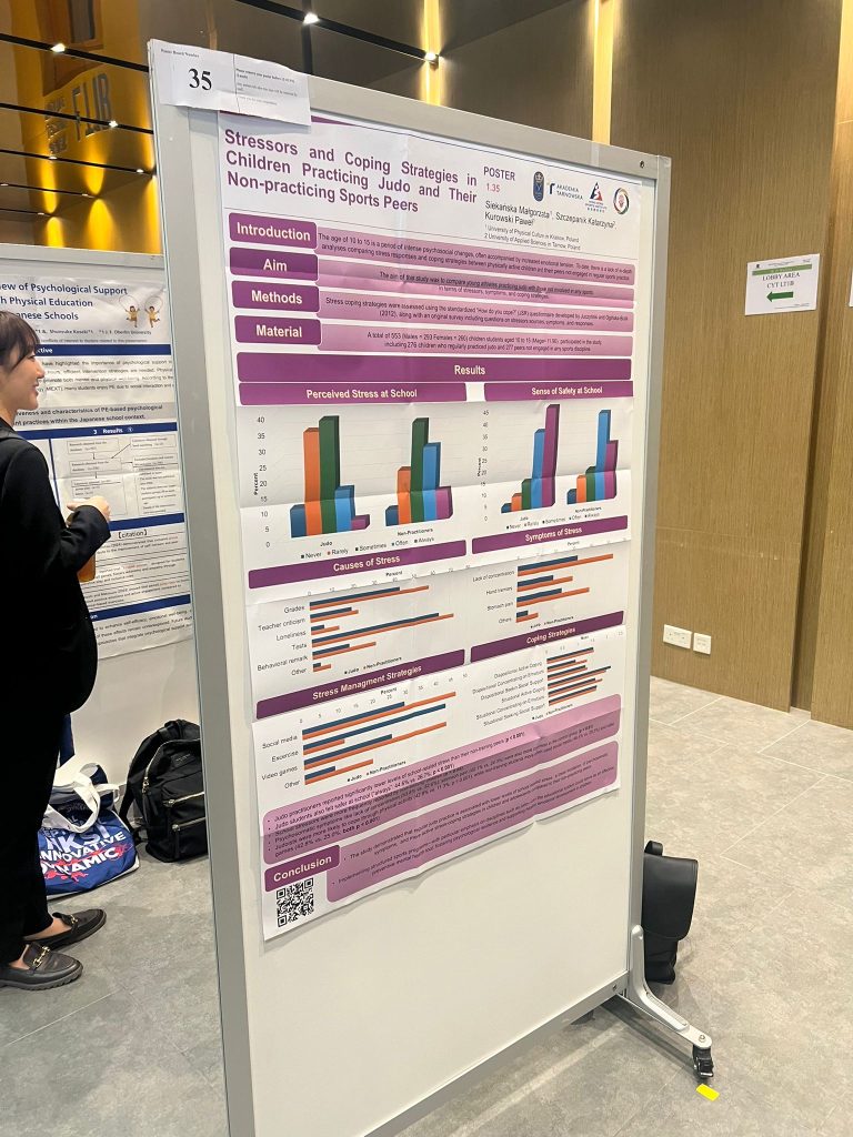 Prezentacja miała formę plakatu naukowego i dotyczyła porównania poziomu stresu, objawów psychosomatycznych oraz strategii radzenia sobie z napięciem u dzieci trenujących judo oraz ich rówieśników nietrenujących sportu. Wyniki analiz wskazują, że regularna aktywność sportowa wiąże się z niższym poziomem stresu szkolnego, rzadszym występowaniem objawów psychosomatycznych oraz częstszym stosowaniem aktywnych, zadaniowych strategii radzenia sobie ze stresem.
