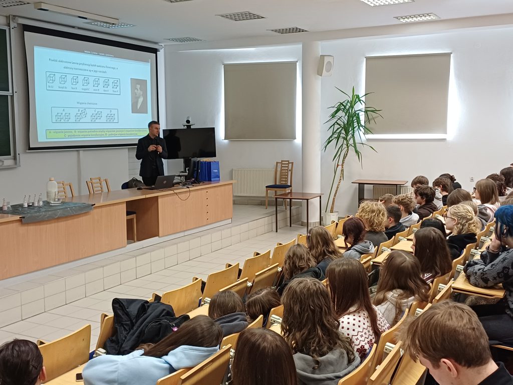 W piątek, 27 lutego, uczniowie liceów i techników mogli wziąć udział w krótkiej podróży przez historię wyobrażeń o budowie materii – od starożytnych żywiołów po współczesne ujęcie kwantowe. Dr inż. Piotr Niemiec opowiedział, jak zmieniało się nasze rozumienie atomu wraz z kolejnymi odkryciami i dlaczego każdy model był ważnym etapem tej drogi. Była to opowieść o tym, jak nauka stopniowo odsłania strukturę świata, który na co dzień wydaje się nam oczywisty.