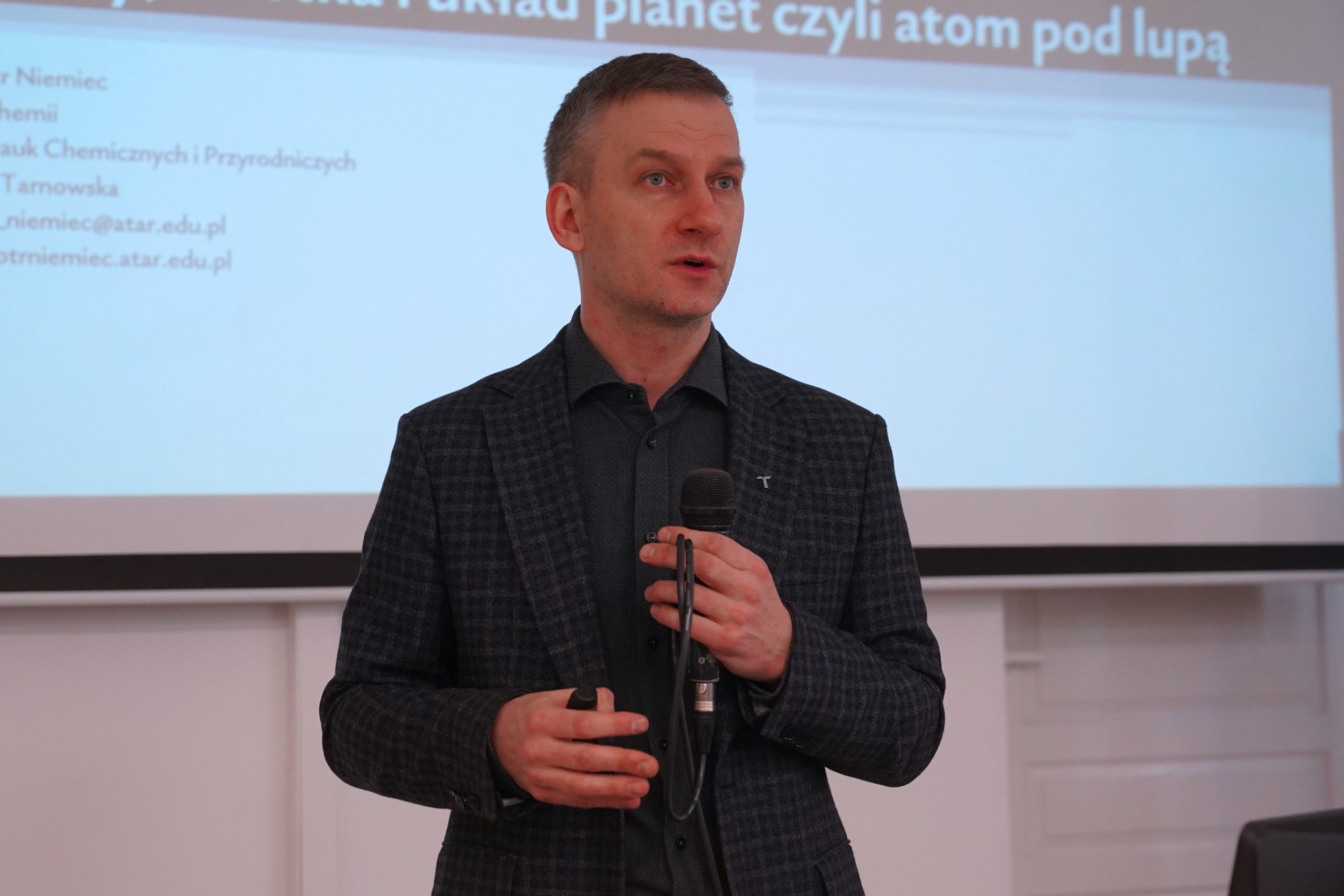W piątek, 27 lutego, uczniowie liceów i techników mogli wziąć udział w krótkiej podróży przez historię wyobrażeń o budowie materii – od starożytnych żywiołów po współczesne ujęcie kwantowe. Dr inż. Piotr Niemiec opowiedział, jak zmieniało się nasze rozumienie atomu wraz z kolejnymi odkryciami i dlaczego każdy model był ważnym etapem tej drogi. Była to opowieść o tym, jak nauka stopniowo odsłania strukturę świata, który na co dzień wydaje się nam oczywisty.